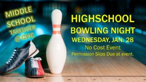 9-12TH Graders will meet at the CEYC to start the Youth Group night and then head over for 2 games of bowling at the Sports Page. This fun night is a no cost event. Students will need to bring a signed permission slip to be able to leave the CEYC with our group that night.